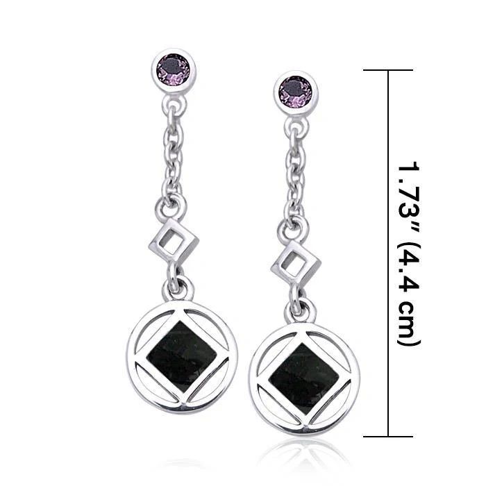 Beautifully made Service Symbol Earring Dangles. These striking earrings are well-made in hypo-allergenic sterling-plated White Bronze with Genuine Amethyst and synthetic Onyx dangles. Amethyst is the stone of healing, while Onyx is the stone of strength, two aspects representing the growth and personal transformation experienced through recovery.