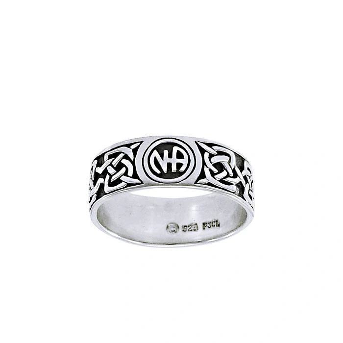 This unique sterling silver ring has a Celtic Knot pattern with the NA Logo repeated 3 times on band. (pic shows one of the symbols) It is a high quality, well made, solid sterling silver ring. Measures 1/4″ wide. Can be worn by both men or women.