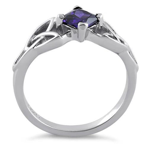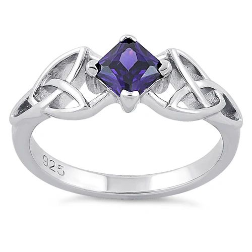 Celtic ring in Sterling Silver in an open-work Celtic knot pattern with a faceted cubic zirconium crystal Service Symbol in Purple