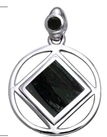 Narcotics Anonymous Eagle Necklace on black adjustable cord with jade beads. Since this is a handmade item, bead pattern will vary. Eagle comes in Gold or Silver finish with Black Service Symbol in center. App. 1″ in size